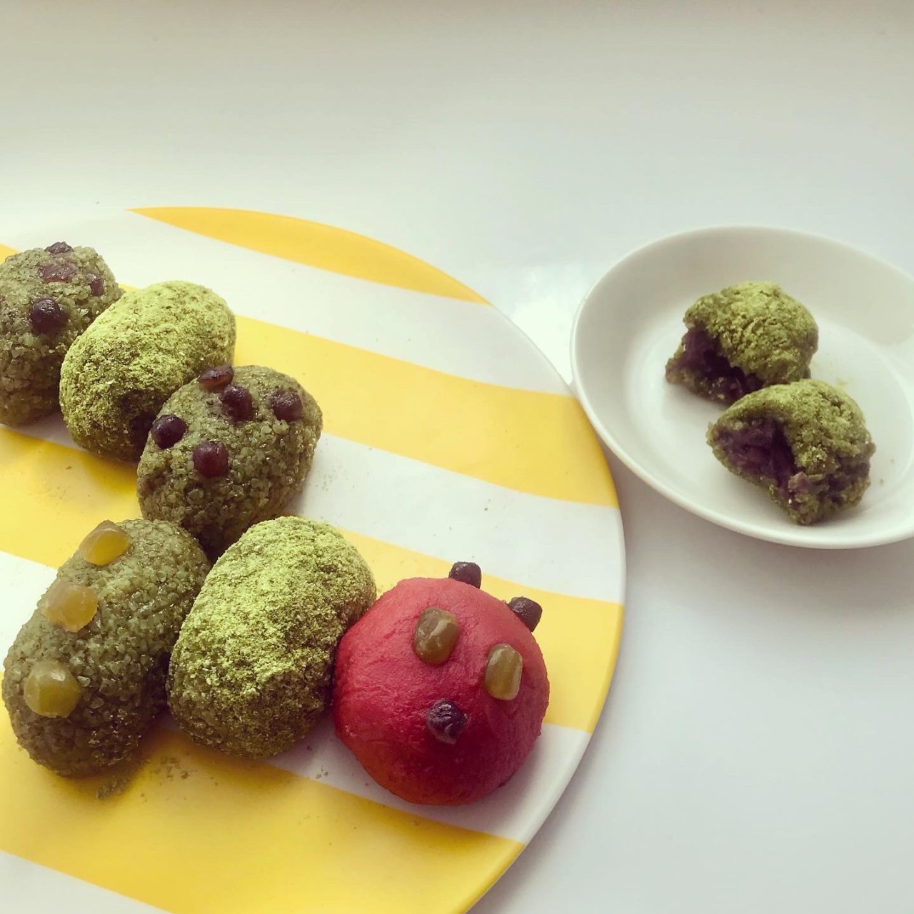 思い立ってひとつはかぼちゃとビーツを混ぜた白餡で包み、はらぺこあおむしを真似てみた。