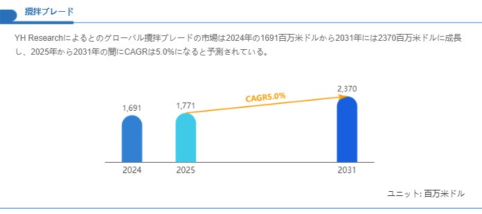 市場規模を整理すると、基準年である2024年のグローバル市場は1,691百万米ドル規模と評価され、2031年には2,370百万米ドルへと拡大する見通しです。この推移に対応する2025年から2031年の年平均成長率は5.0%に相当すると算定されており、堅調な拡大基調が想定されます。成長を下支えする要因としては、プロセス産業における生産効率化要求の高まりと、品質・一貫性確保のための先進的撹拌技術への投資増が挙げられます。特に製薬や食品分野では製品均一性と微粒子分散の精度が厳格に求められるため、高性能ブレードの需要が比較的強く推移していることが背景にあります。