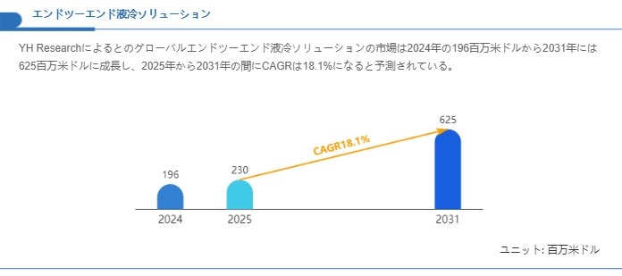 YH Researchの評価によれば、エンドツーエンド液冷ソリューションのグローバル市場は2024年に1億9,600万米ドル規模と推定され、2031年には6億2,500万米ドルへ拡大すると見込まれており、予測期間となる2025年〜2031年の年平均成長率(CAGR)は約18.1%に達するとされています。