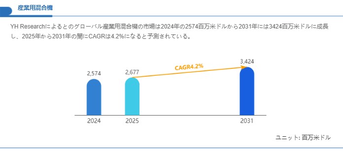 市場規模については、YH Research の推計を踏まえると、グローバルにおける産業用混合機の市場は2024年に2,574百万米ドルと評価され、2031年には3,424百万米ドルへと拡大する見込みであり、予測期間の2025年から2031年にかけて年平均成長率(CAGR)は約4.2%と算出されています。