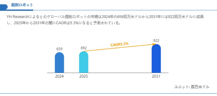 掘削ロボットの産業は、自律化技術、センシング能力、耐環境機構の進化に伴って段階的に成熟してきています。現時点の市場規模評価に照らすと、基準年である2024年のグローバル市場は6億5,900万米ドル相当と見積もられており、将来展望では2031年に9億2,200万米ドル規模へと拡大すると推定されています。これに基づけば、2025年から2031年にかけての年平均成長率はおおむね5.3%程度で推移すると計算されます。この成長率は急進的な拡大ではないものの、用途拡大と技術成熟の継続により、安定した市場拡大が期待されることを示しています。