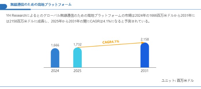 2020年~2025年の実績データと、2026年~2031年の将来予測に基づいて、無線通信のための高地プラットフォーム市場の規模、成長率、構造変化を定量的に評価します。中長期的な戦略立案・投資判断の基盤となる分析結果を提供します。