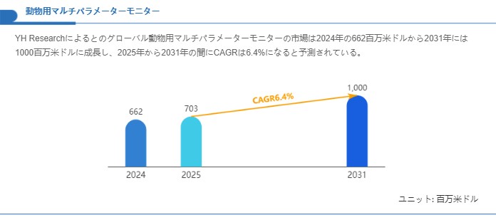 市場規模の見通しに関しては、YH Researchの推計を踏まえると、本市場は2024年に662百万米ドルの規模に達しており、今後の拡大により2031年には1000百万米ドルに到達する見込みであるとされています。この推計に基づくと、2025年から2031年の期間における年平均成長率(CAGR)は6.4%となり、中期的に着実な成長軌道にあることが示唆されます。成長を支える主要因としては、臨床現場における高度化要求とそれに伴う装置更新、幅広い動物種への適用ニーズ、及び手術・救急対応能力の強化といった設備面の投資需要が挙げられます。これらは、単に新規導入を促すだけでなく、既存機器の高機能化・周辺消耗品の継続需要を通じて市場の裾野を広げる動きにつながります。