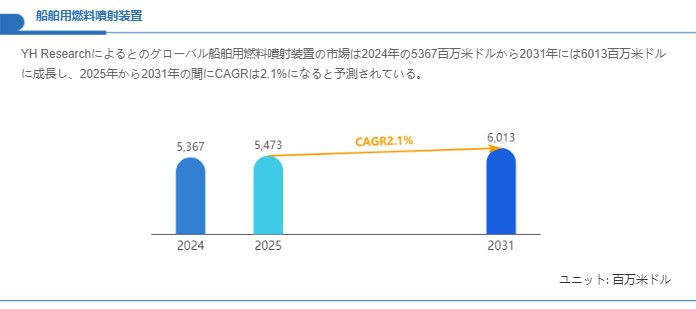 最新の推計によりますと、2024年時点の世界の船舶用燃料噴射装置市場は5,367百万米ドル規模に達しており、2031年には6,013百万米ドルへと拡大する見通しです。2025年から2031年の年平均成長率は約2.1%とされ、成長ペースは緩やかです。このような落ち着いた成長プロファイルの背景には、艦船の長寿命化による更新サイクルの長期化、既存船向け改修需要の安定性、燃料多様化に対する装置仕様調整の時間的ラグなどが影響していると考えられます。