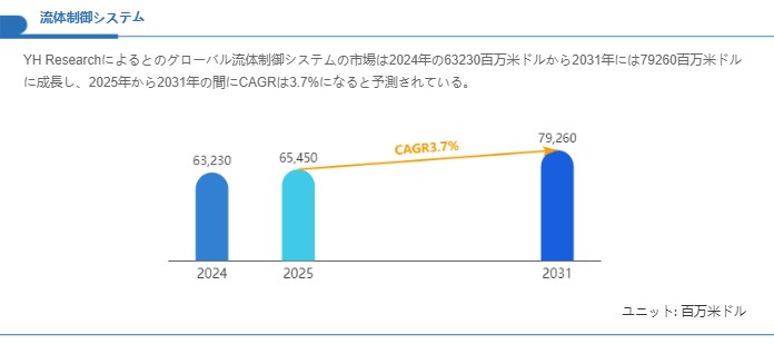 流体制御システム市場は、2024年の63,230百万米ドルから2031年の79,260百万米ドルへの拡大が見込まれており、2025年~2031年の年平均成長率は3.7%と算出されています。安定的な需要基盤の上に技術革新とサービス化が進展することで、市場は段階的に拡大していく見通しです。ハード・ソフト・サービスの統合による価値提供と、サプライチェーンおよび運用体制の強化が、今後の競争環境における重要な評価軸になると整理できます。