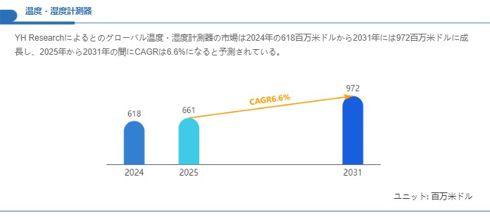 YH Researchの最新調査によると、世界の温度・湿度計測器市場は、2024年の618百万米ドルから2025年には661百万米ドルへと拡大し、2031年には972百万米ドルに達すると予測されています。この間、CAGR(年平均成長率)は6.6%と推計されています。