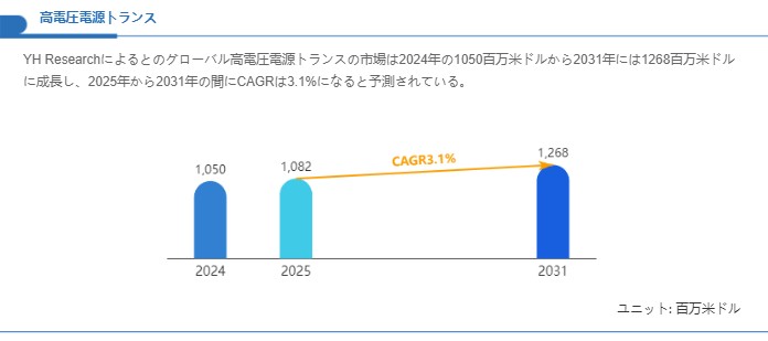 YH Researchの調査では、2025年から2031年にかけて、高電圧電源トランスの世界市場は年平均成長率(CAGR)3.1%で拡大を続けると予測されています。2024年には約1050百万米ドルだった市場規模は、2025年には1082百万米ドルに達し、2031年には1268百万米ドル規模に成長する見込みです。この成長は、技術革新や需要の高まり、産業構造の変化といった要因に後押しされています。