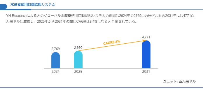 技術革新と養殖業の効率化ニーズが重なり、市場は高い成長ポテンシャルを示しています。市場規模は2024年の約2,769百万米ドルから2031年の約4,771百万米ドルへ拡大し、2025–2031年の年平均成長率は約8.4%と見込まれるため、製品開発とサービス体制の整備が今後の競争優位に直結します。
