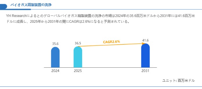 バイオガス精製装置の洗浄は、バイオメタンの品質確保と設備稼働率維持に不可欠な要素であり、個別設備の特性と現場条件に応じた洗浄プロトコルの設計がTCOと事業収益性に直接影響します。市場面では、2024年の市場規模が35.6百万米ドルであるのに対し、2031年には41.6百万米ドル程度へと拡大する見込みであり、2025年から2031年の年間平均成長率はおおむね2.6%の水準が見込まれます。この成長環境下で、洗浄技術の高度化、プロセス自動化、及びサービスモデルの成熟が事業価値の重要な源泉になると考えられます。