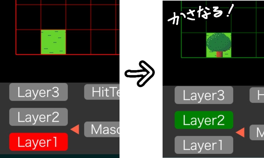 Layer1に「草地」の素材を置いた後、Layer2を選択し同じマスに「木」の素材を置けば「草地に生えた木」になります。