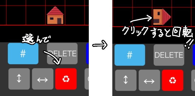 回転ボタンを押した後、配置した「家」をクリックで家が寝ます(回転の場合クリックするたびに90度ずつ回転します。)