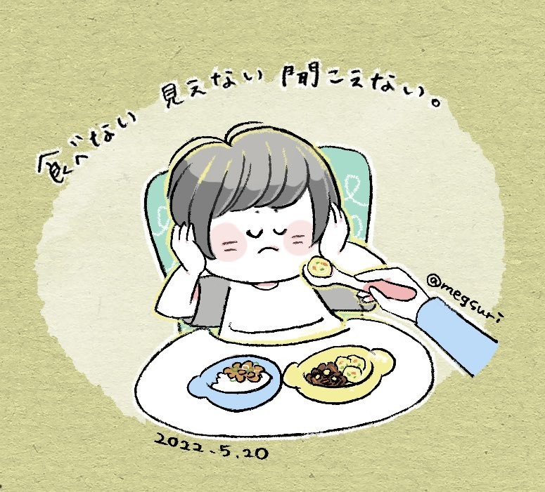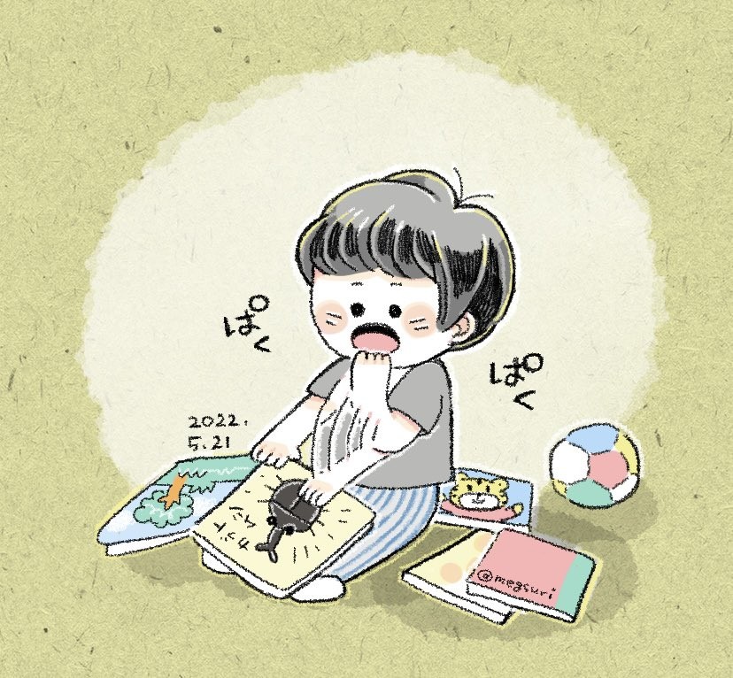 絵本のカブトムシを食べる息子。ごはんを食べてくれ。