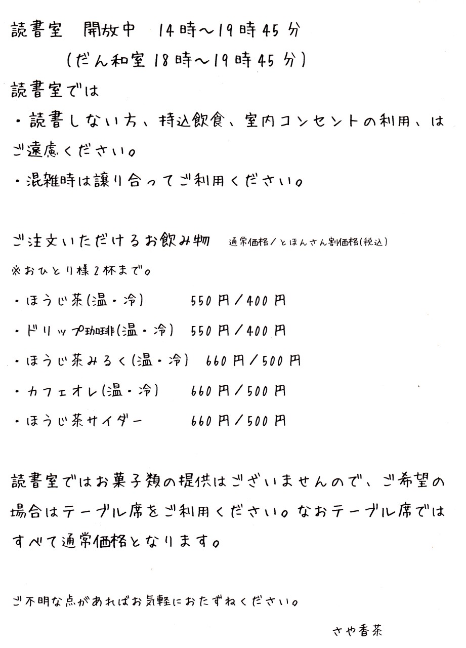 だん和室(談話室)と称して、さや香茶のほぼ全営業日の18:00〜19:45(暫定)に開放しています。注文は必須ではありません。多少のルールはございますが、読書、ゲーム、自習、雑談、休憩、勉強会、などなどそれなりに自由にお使いいただけます。混雑時は譲り合ってご利用ください。控えていただきたいこと(多少のルール)