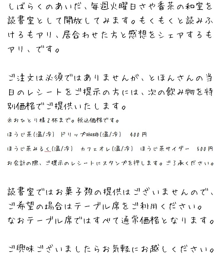 だいたい毎週火曜、読書室として実験的に開放してみます(25年12月開始)。実験的なのですぐやめるかもしれません。