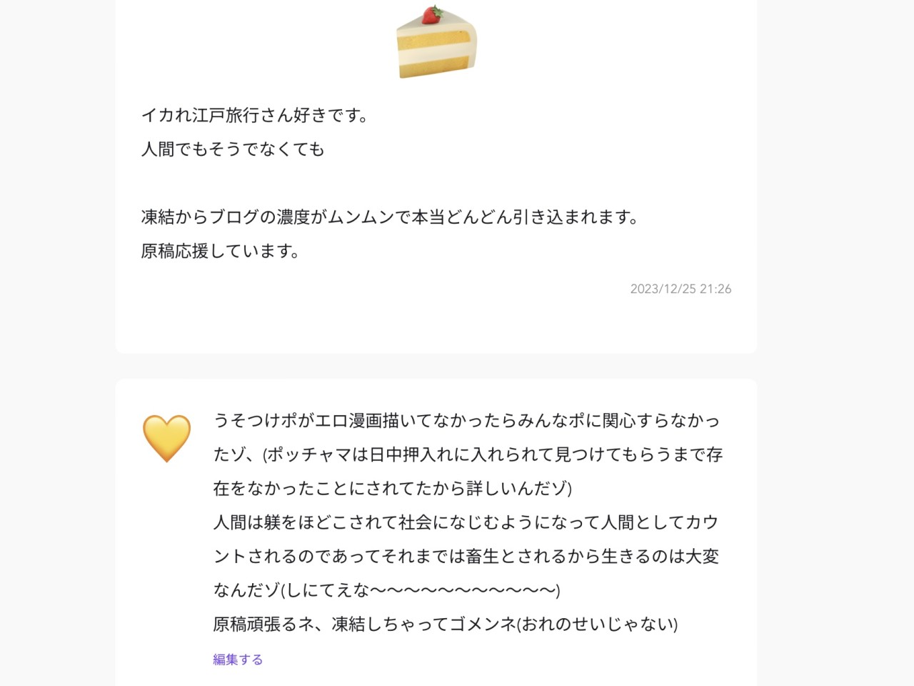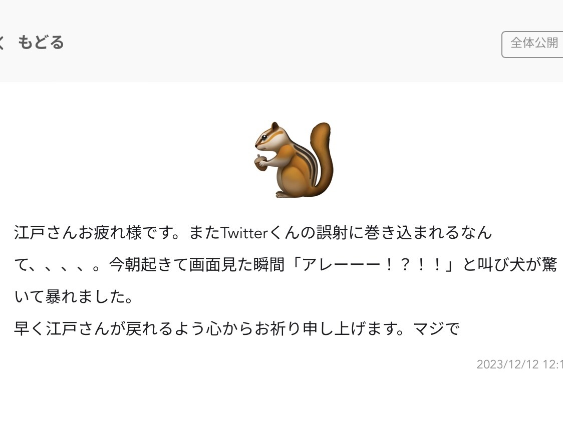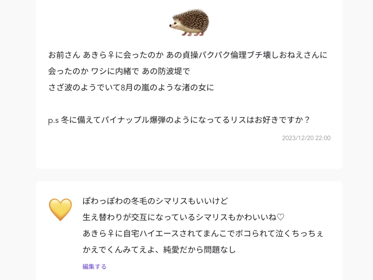 見つけにきてくれてどうもヘペトナス!!!!イカれ江戸旅行は姿を変え形を変え、風になって水になって生きています、Twitterを凍結されたことで睡眠時間が3時間のびました、けどいろんなシコりチャンスを逃している気がします、シマリスの肩甲骨見抜きしてえよ