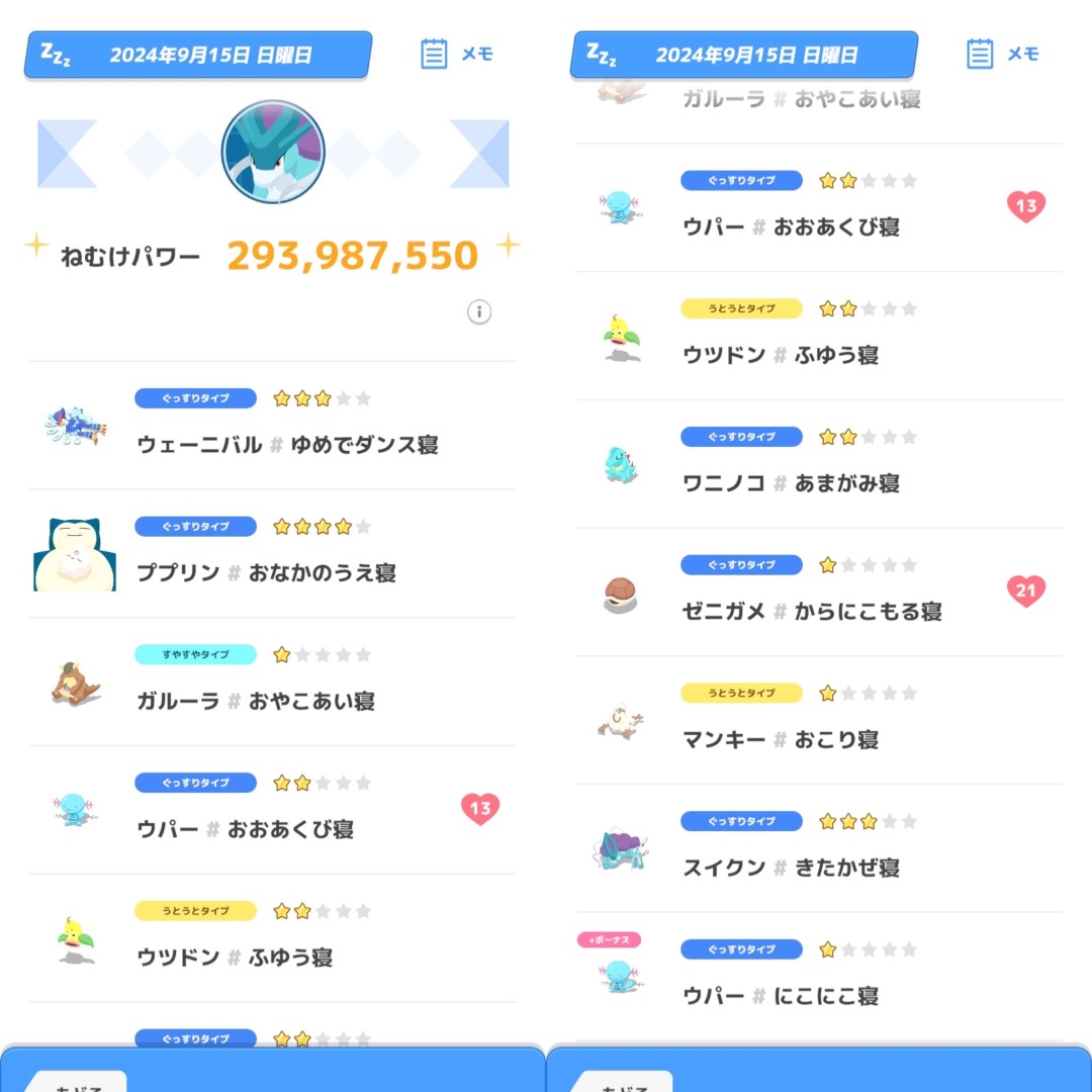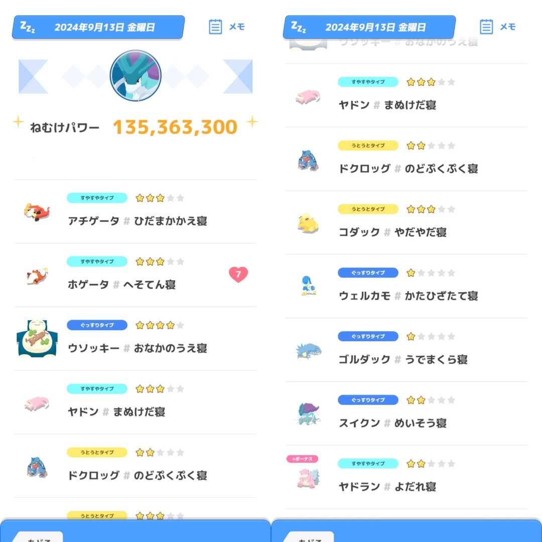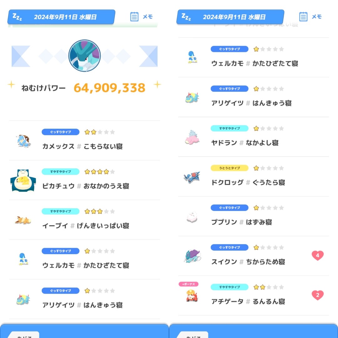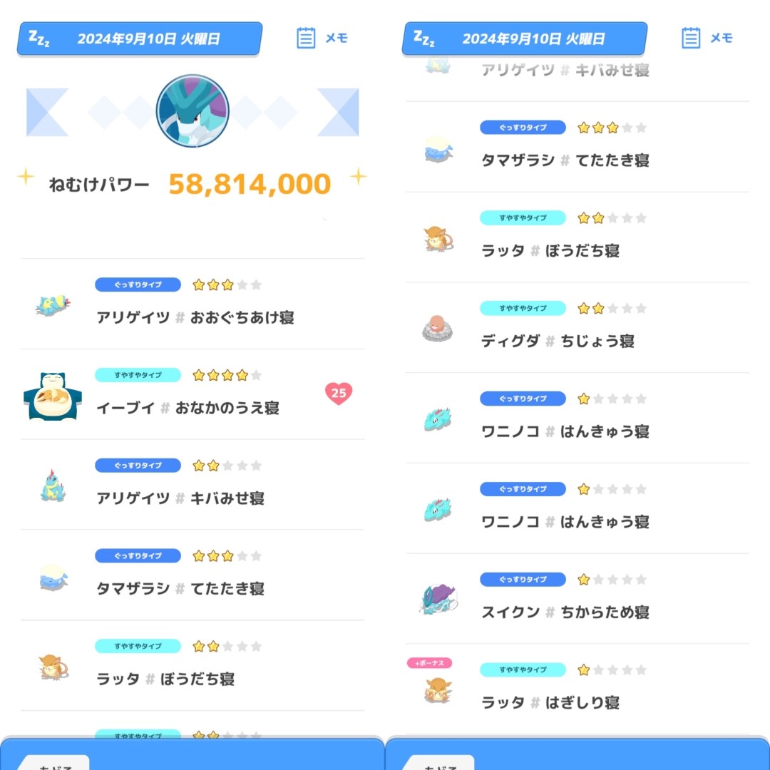 ライコウイベントの時は始めてまもなく、エンテイイベントは始めて2ヶ月ほどで、寝顔コンプリートには至らなかったのを思うと、うちの子達が成長したのかな?と思います。