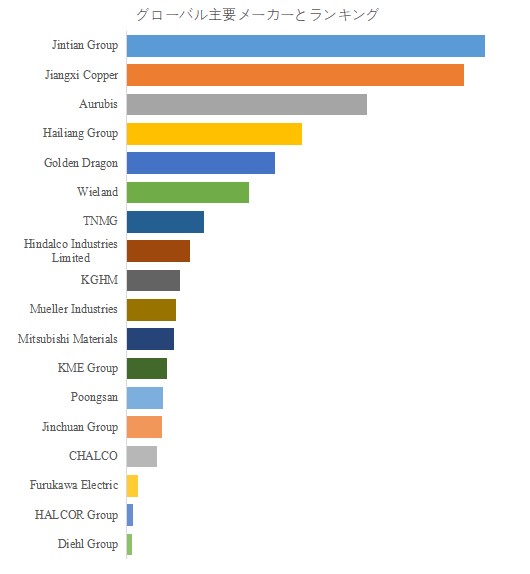 YHResearchのトップ企業研究センターによると、銅の世界的な主要製造業者には、Jintian Group、Jiangxi Copper、Aurubis、Hailiang Group、Golden Dragon、Wieland、Hindalco Industries Limited、TNMG、KGHM、Mueller Industriesなどが含まれている。2024年、世界のトップ10企業は売上の観点から約29.0%の市場シェアを持っていた。