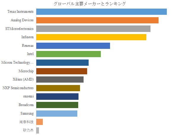 産業用チップ市場の競争環境は、技術力、生産体制、コスト競争力などの要素により分かれている。大手半導体メーカーは、長年の研究開発により確立した最先端の製造技術と大規模な生産体制を武器に、高品質な産業用チップを安定供給できる体制を構築している。これらの企業は、自動車メーカーや工場自動化システムメーカーなど大手顧客を獲得しており、市場の主要なシェアを占めている。一方、新興企業やベンチャー企業は、特定のニッチ市場に特化した高性能なチップを開発することで、既存企業との差別化を図っている。また、より低コストな生産プロセスや、環境負荷の低い代替技術の開発にも力を入れており、新しい市場ニーズに対応しつつある。また、一部の企業は、ソフトウェア技術や AI 技術との融合により、ハードウェアだけでなく、ソリューション提供能力を高めることで、顧客に対するアプローチを拡大している。