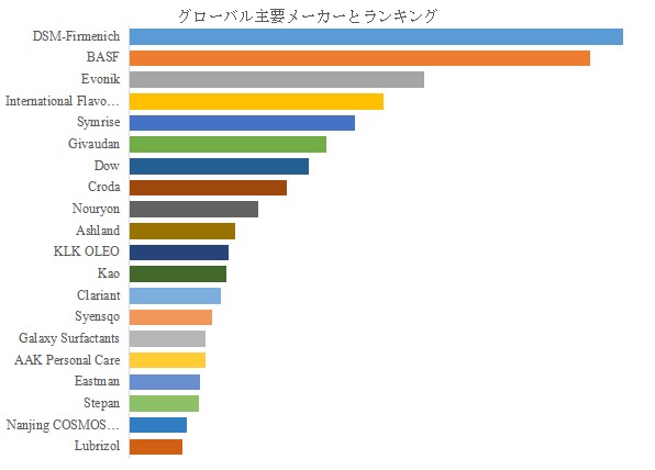 データによると、化粧品原料業界は高度に集中化が進んでいることが明確である。トップ企業が市場の大半を占める状況は、技術力や研究開発能力の差異が競争優位性を左右していることを示す。これにより中小規模の企業は特化したニッチ分野や差別化された製品開発に注力せざるを得ない構図が形成されている。