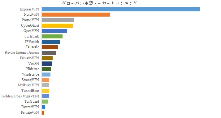 YHResearchのトップ企業研究センターによると、VPNサービスの世界的な主要製造業者には、ExpressVPN、NordVPN、ProtonVPN、CyberGhost、OpenVPN、Surfshark、IPVanish、Tailscale、Private Internet Access、PrivadoVPNなどが含まれている。2024年、世界のトップ5企業は売上の観点から約36.0%の市場シェアを持っていた。