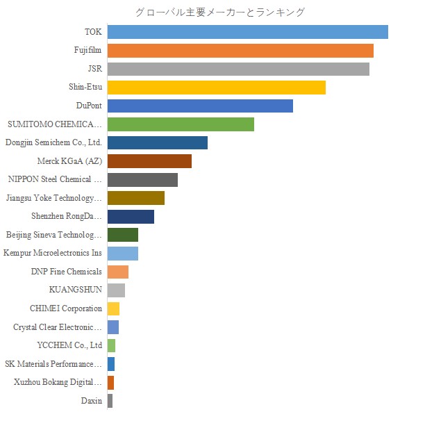 (2)主要企業の情報:世界のフォトレジスト市場における主要企業の売上、価格、シェア、ランキングについて詳細に分析し、競争環境と企業の立ち位置を理解するための指針を提供します。(2020~2025)