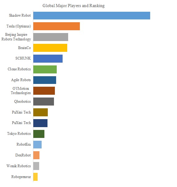 多指巧妙ハンド市場は、技術的な難易度と研究開発コストの高さから、新規参入障壁が高く、主要プレイヤーによる寡占状態にある。2024年時点では、Shadow Robot、Tesla (Optimus)、Beijing Inspire Robots Technology、BrainCo、SCHUNK、Clone Roboticsなど、トップ10社が全体の約63.0%の市場シェアを占めており、それぞれが独自の制御技術やセンサ融合技術を持つことが特徴である。多くの企業がロボット用AIアルゴリズムとの統合を進めており、「単なるハードウェア」から「インテリジェントなハンド」への進化が求められている。また、中国企業やスタートアップの積極的な技術投入も市場の競争環境を活性化させており、欧米とアジアの技術開発が同時に進むダイナミックな産業構造となっている。