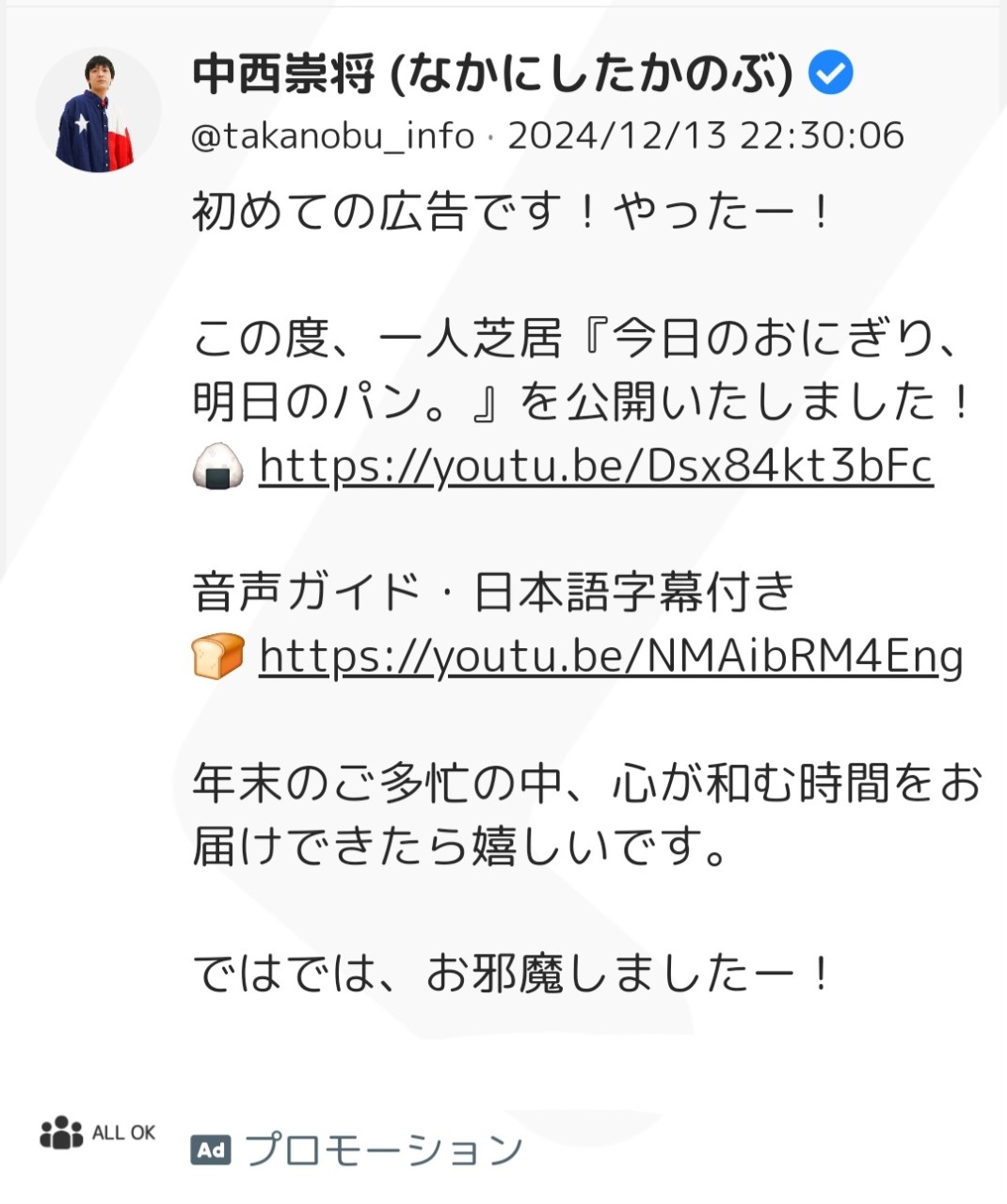 『今日のおにぎり、明日のパン。』の広告配信が終了した。緊張も大いにあったが、自分のタイムラインに自分のプロモーションが流れてきて笑ってしまって、何だかそれだけでとても解れていくのがわかった。一人では抱え切れないくらいの幸せをいただき、全てがプレゼントみたいな時間だった。クリスマスがあって良かった。浮かれてしまっているのがバレないから。