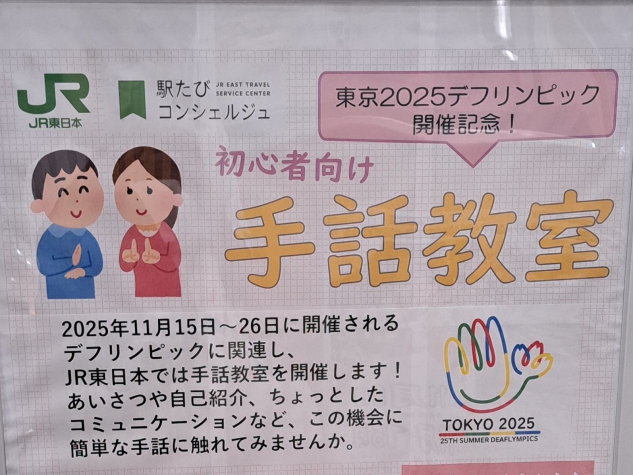 そんなデフリンピック開催にあたり、初心者向けの手話教室が先日JR東日本の主催で行われた。山手線を使った移動の際にたまたまポスターを見かけて知り、すぐにスケジュールと相談して10月の空き枠に申し込んだのであった。