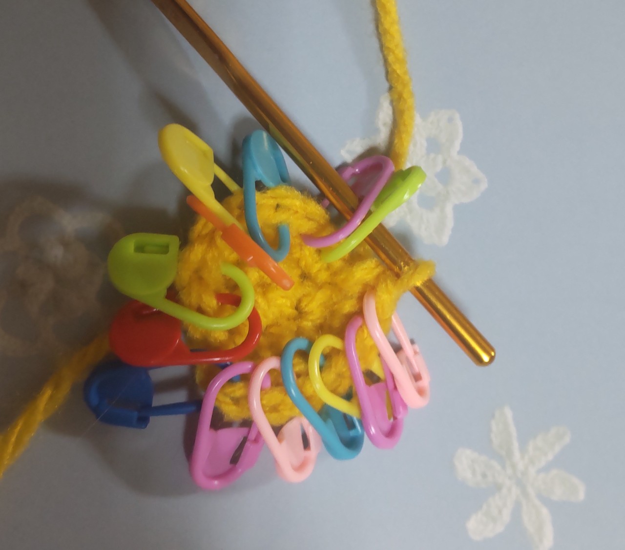 あと、途中でやめるときも『青色マーカーから増やし目』というように、メモをしておくと、どこから何編みで再開するとか覚えなくていいし、混乱することもないので、おすすめです。