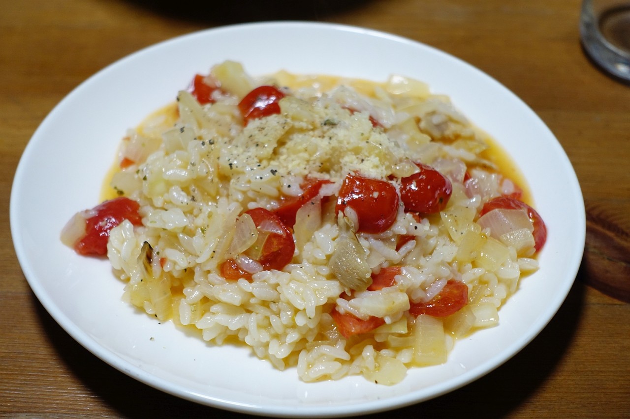 5:好みの硬さ、煮詰まり具合になるまで火を通したら器に盛り、粉チーズ、胡椒、オレガノなどをお好みでかけたら出来上がり。