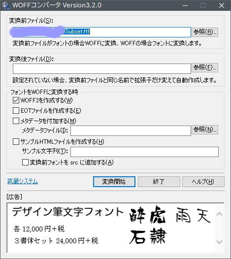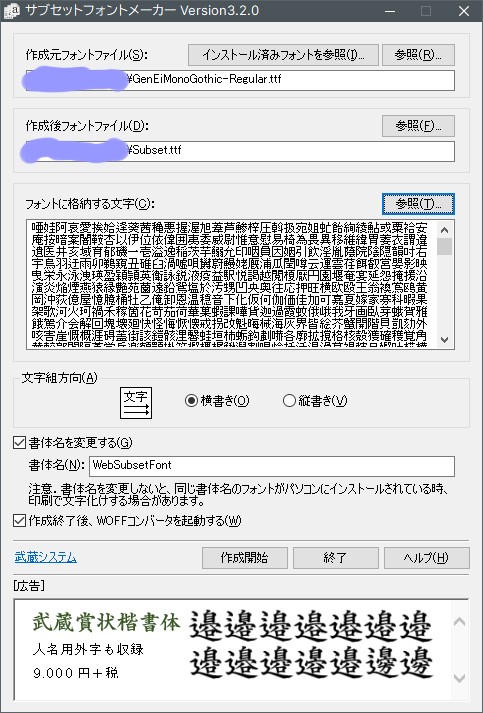 ありがたいことに、武蔵システムさんがフリーソフトの「サブセットフォントメーカー」「WOFFコンバータ」を公開されています。