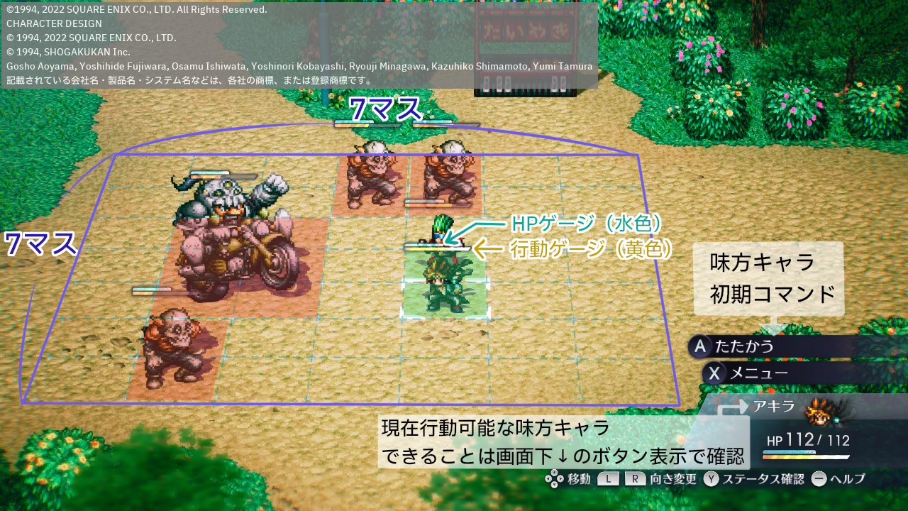 リメイク版はスクエニさんが利用規約を出しているので、それを守ればスクリーンショットを掲載してもOKなのですが、スーファミ版はそういう訳にもいかず……(スーファミ版のプレイ動画とか、検索するとたくさんありますけど、私が調べた限り、スクウェアさんの古いゲームの規約は見当たらない)。