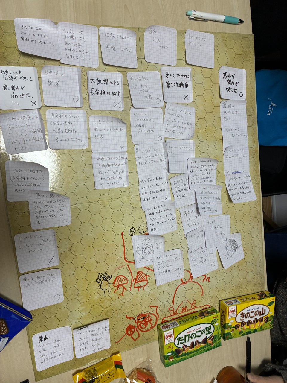 今回初プレイのプレイヤーばっかりだった上に、最初から戦乱の世にする気満々で、おやつにきのこの山とたけのこの里を買ってきたトンチキプレイヤーがいたので、人類の歴史ではなくお菓子大戦争になりました。すみません私が買いました。
