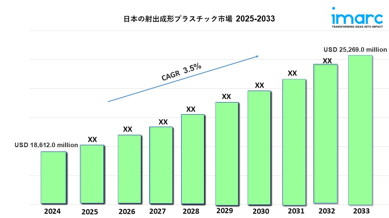 IMARCグループの最新レポートによると、日本の射出成形プラスチックの市場規模は2024年に186億1,200万米ドルに達しました。今後、IMARCグループは、2025年から2033年の予測期間中に3.5%の年平均成長率(CAGR)を示し、2033年までに252億6,900万米ドルに達すると予想しています。