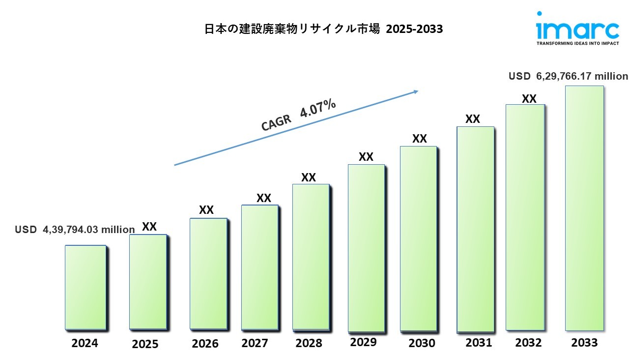 IMARCグループの最新の調査出版物「日本の建設廃棄物リサイクル市場の規模、シェア、傾向、および材料、供給源、サービス、地域別の予測、2025-2033年」によると、日本の建設廃棄物リサイクル市場の規模は2024年に439,794.03百万米ドルに達しました。今後、IMARCグループは、市場が2033年までに629,766.17百万米ドルに達し、2025年から2033年の間に4.07%の成長率(CAGR)を示すと予測しています。