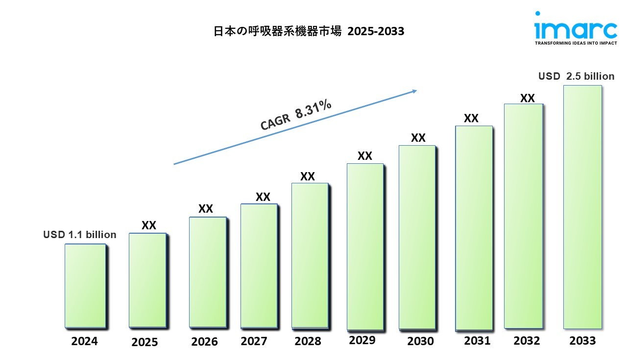 IMARCグループの最新の調査出版物「日本呼吸器機器市場レポート(タイプ別(診断・モニタリング機器、治療機器、使い捨て機器)、地域別2025~2033年)」によると、 日本の呼吸器機器市場規模2024年には11億米ドルに達しました。今後、IMARCグループは、市場が2033年までに25億米ドルに達し、2025年から2033年の間に8.31%の成長率(CAGR)を示すと予測しています。
