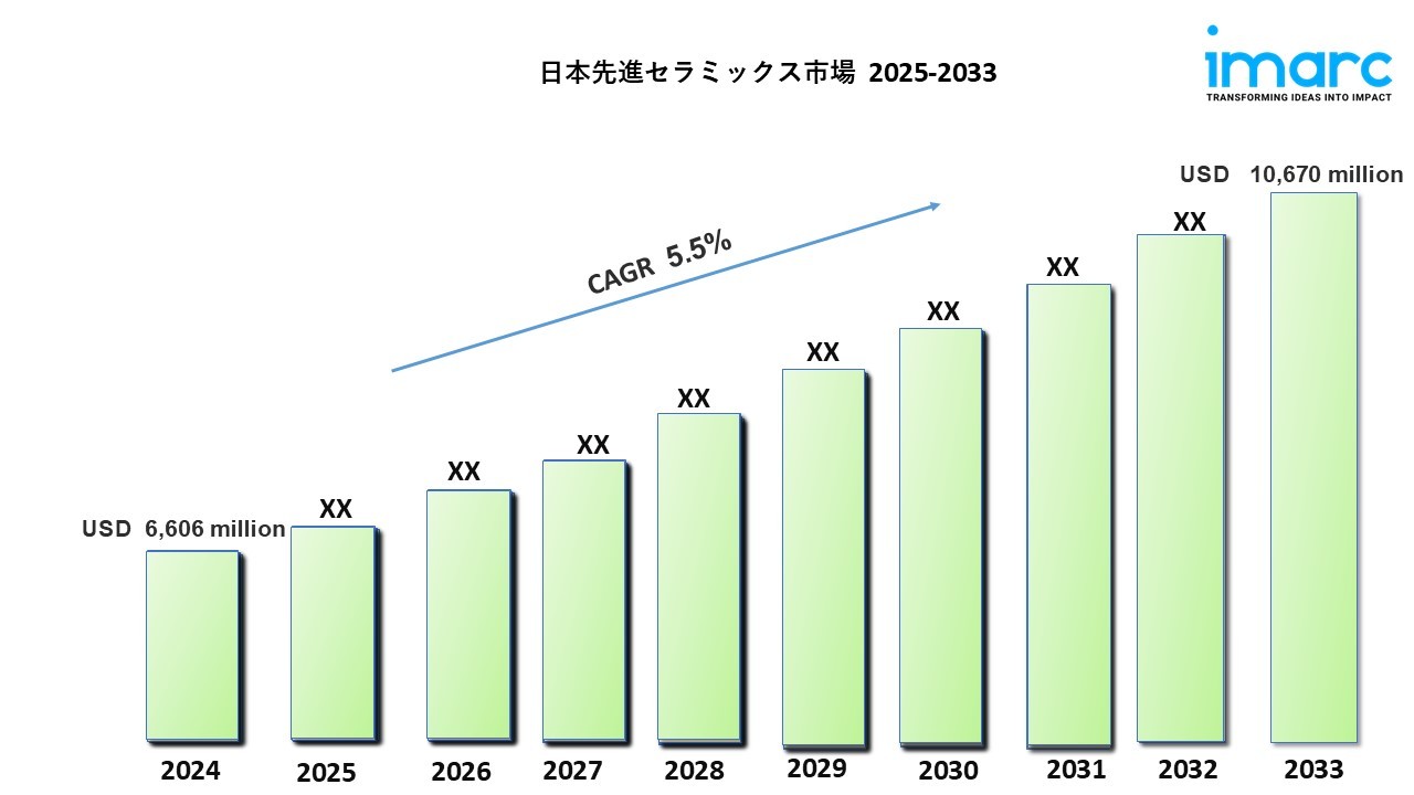 IMARCグループの最新の調査出版物「日本先進セラミックス市場レポート:材質別、クラス別、最終用途産業別、地域別2025-12033」によると、 日本の先端セラミックス市場規模2024年には66億600万米ドルに達しました。今後、IMARCグループは、市場が2033年までに106億7000万米ドルに達し、2025年から2033年の間に5.5%の成長率(CAGR)を示すと予測しています。