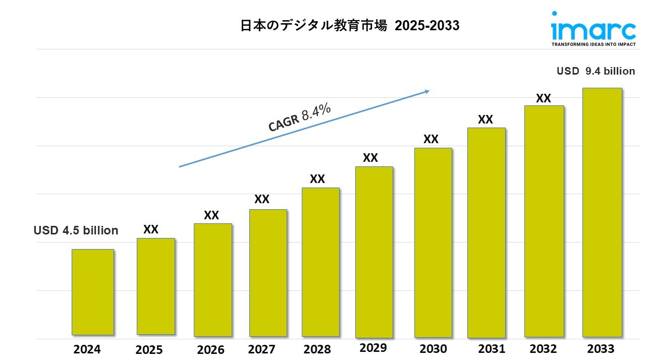 IMARCグループの最新レポートによると、 日本のデジタル教育市場規模2024年には45億米ドルに達しました。今後、IMARCグループは、市場が2033年までに94億米ドルに達し、2025年から2033年にかけて8.4%のCAGRを示すと予測しています。