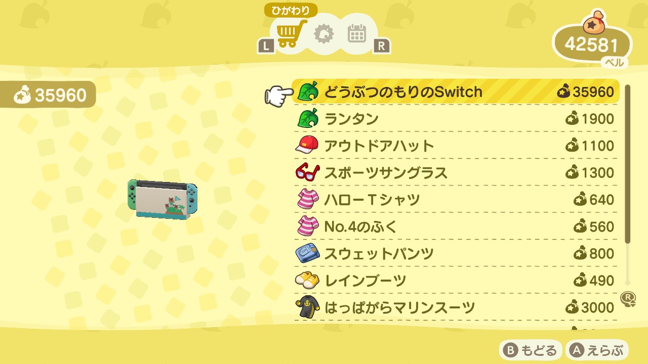 また、前回に続いてゲームハード家具もありました。今回はどうぶつのもりのswitch。なんと実際の定価で売られるという忠実さです。貯金を崩す事となりましたが、なんとか購入。とび森ではNew3DSやWiiUがあり、ミニゲームが遊べましたが今回はそれらしいのはないようです。ちょっと残念。