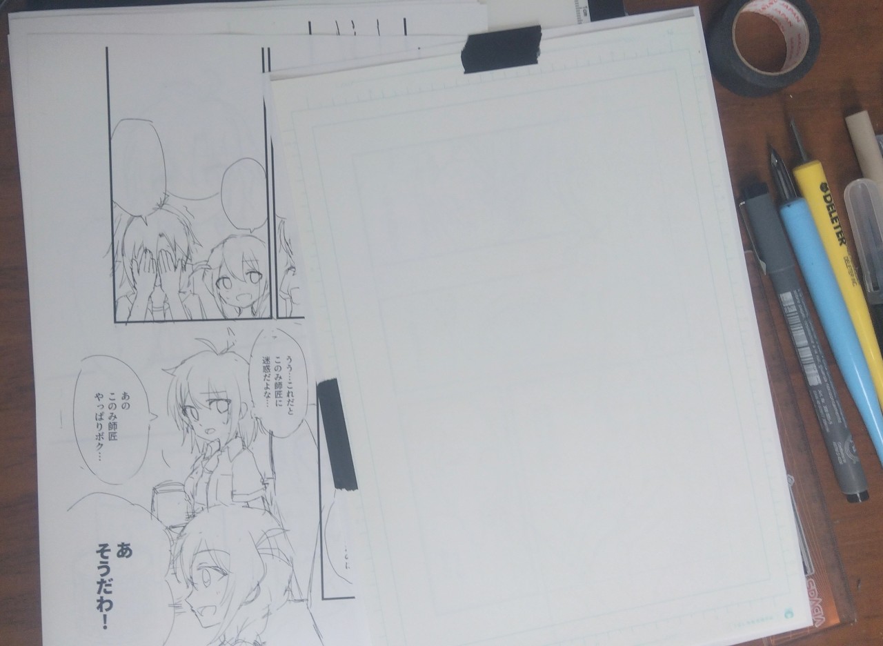 で、原稿ですね。アイビスペイントで描いた下絵をコンビニでB5サイズでプリントし、それをトレースする形でペン入れしていきます。