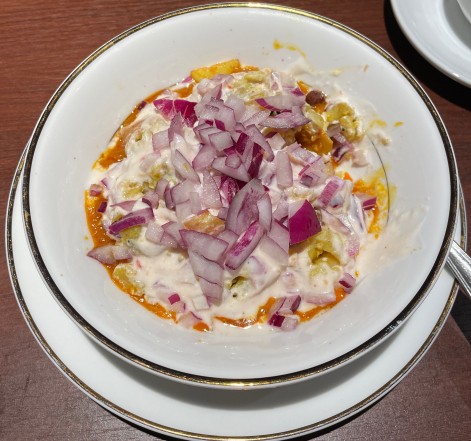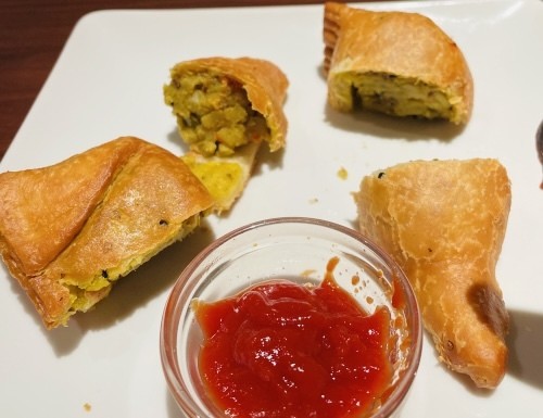 サモサの上に刻んだ玉ねぎとヨーグルトが乗っかってます。