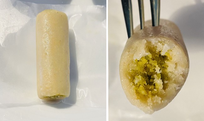 ▲カジュピスタロール (季節限定) カシューナッツとミルクを煮詰めた生地で ピスタチオフィリングを巻いたもの。