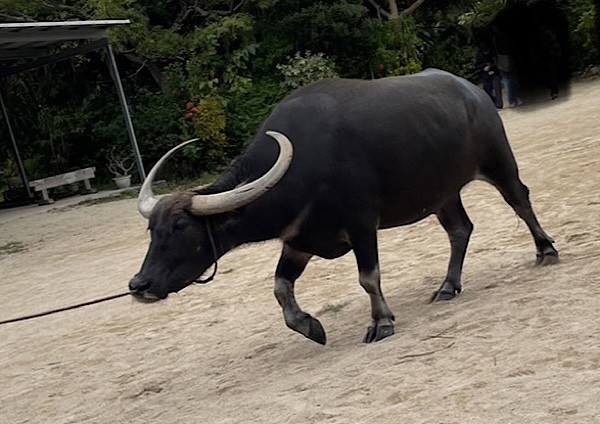 ▼飼い主さんに引っ張られる水牛ちゃん(めちゃくちゃ可愛い)