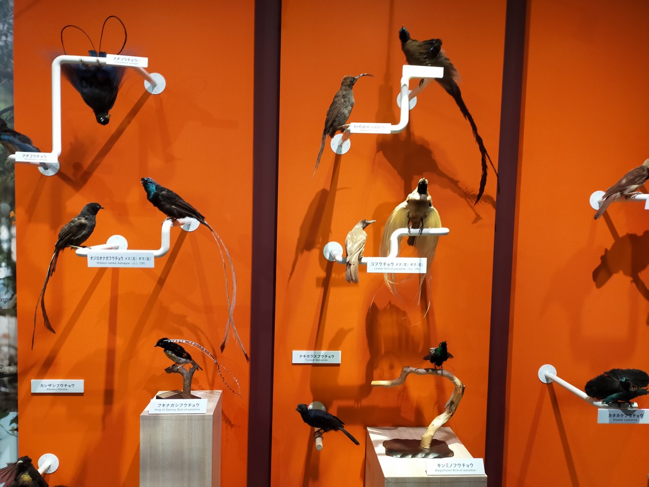 カラスやセキレイ等身近な鳥も多いスズメ目は現生鳥類の半数以上を占め多様化してるから展示スペースも広い。人が多くて写真はあきらめたけど、あのシマエナガのはく製もあってスズメより小さい!でも恐竜の生き残りなんだよな…