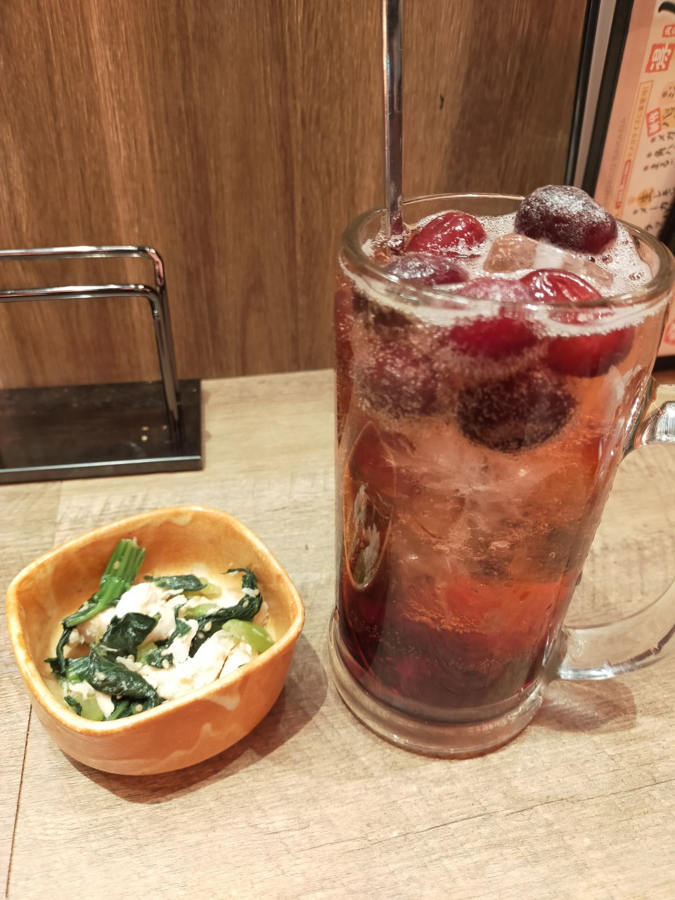 ぶどうが入ったカシスサワーと肉巻きおにぎり。この日は車の運転しないので飲む事に。でも酔いすぎても困るから1杯まで。たこ焼きも頼んだけど写真は撮らず。外がカリカリのたこ焼きは確かに銀だこを感じる。