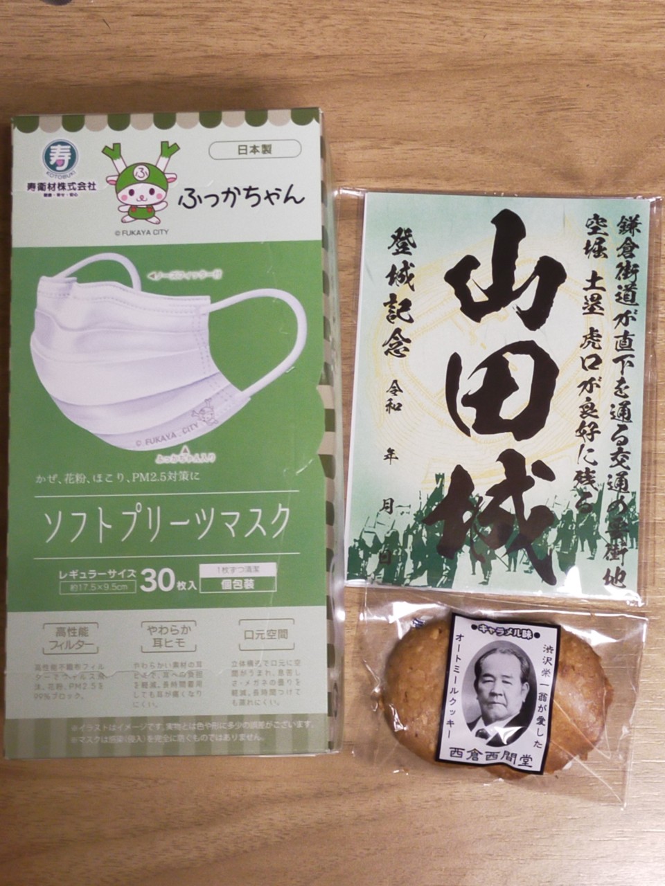 森林公園近くで自販機販売されてた山田城の御城印と、道の駅で買ったマスク(実用的なゆるキャラグッズ…)と試し買いのオートミールクッキー。