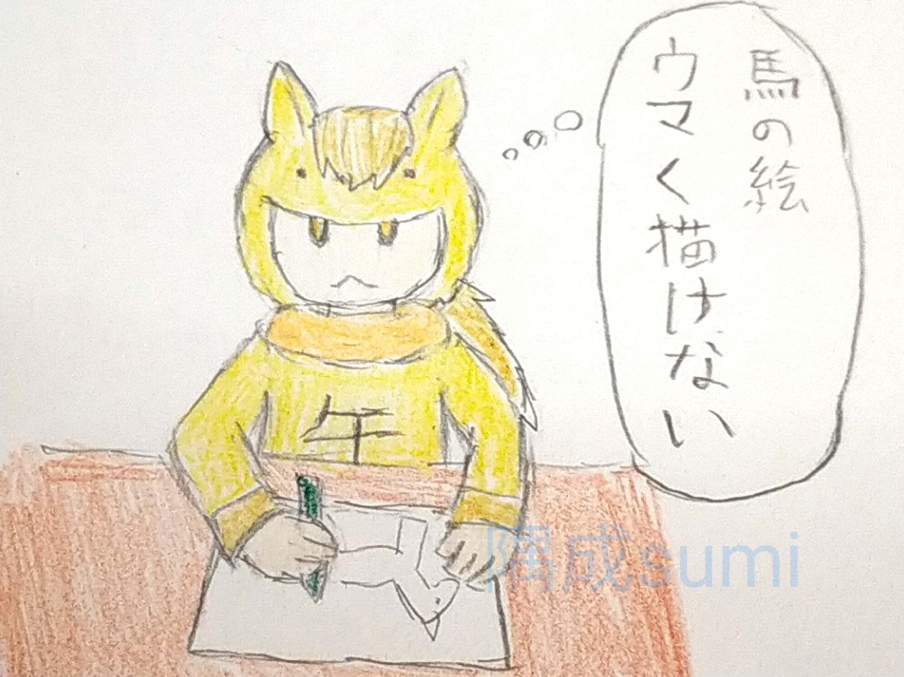馬の絵を描く、うちの「イエロー」(午年仕様、こう見えて武闘家タイプ)。本当は馬に乗ってる絵を描きたかったけど断念してこんな絵に…「馬の絵ウマく描けない」