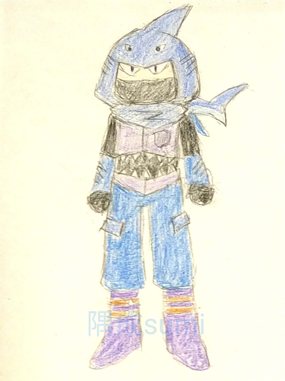 お腹部分をサメの口のようにしてみた。盗賊系といっても地域や時代によって服装は違うのでデザインに悩んだ。