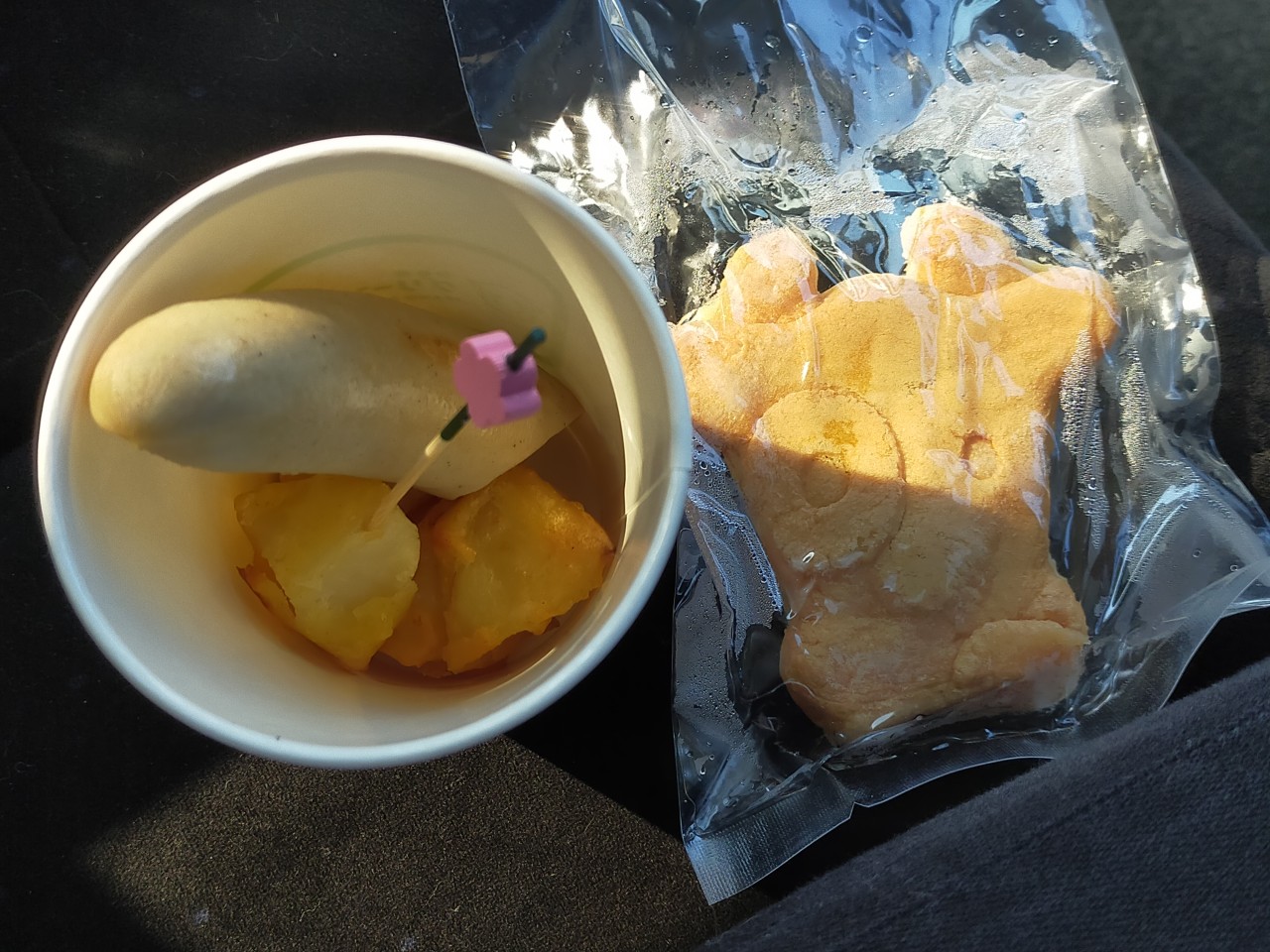 軽食。ハーフサイズのフランクフルトと少量のポテトの入ったカップ、牛型の焼菓子(甘いものもあるが、写真のは中身トマトカレー)。