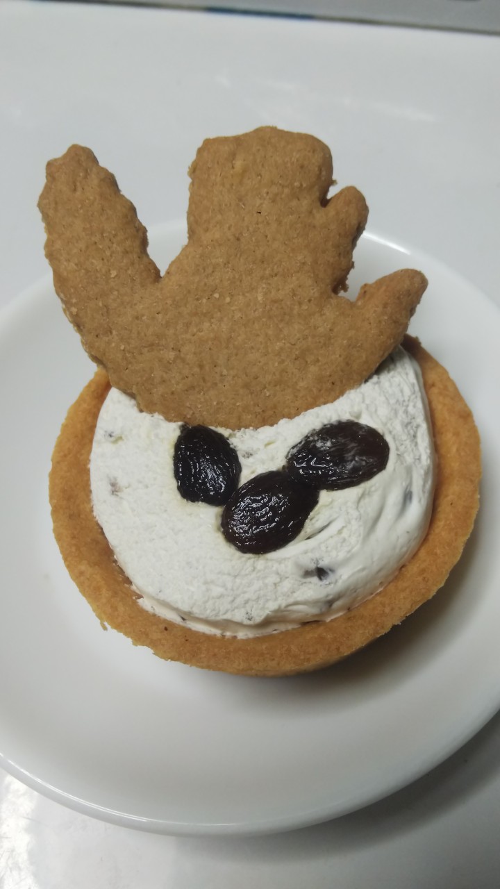 ラムレーズンのタルトにクッキー缶最後の1枚(でっけーリス)を乗っけて食べました。